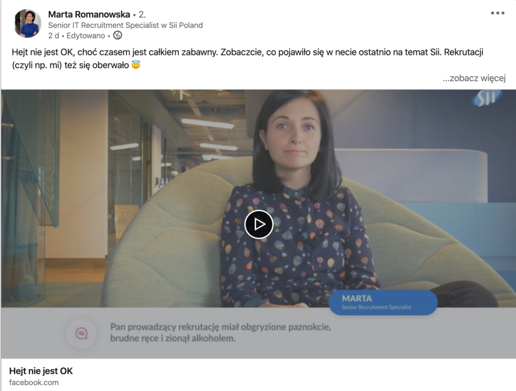 Na profilach LinkedIn pojawiają się wpisy zawierające jasne stanowisko pracowników, które z łatwością wyszukacie używając hasztag #hejtniejestOK w wyszukiwarce treści.